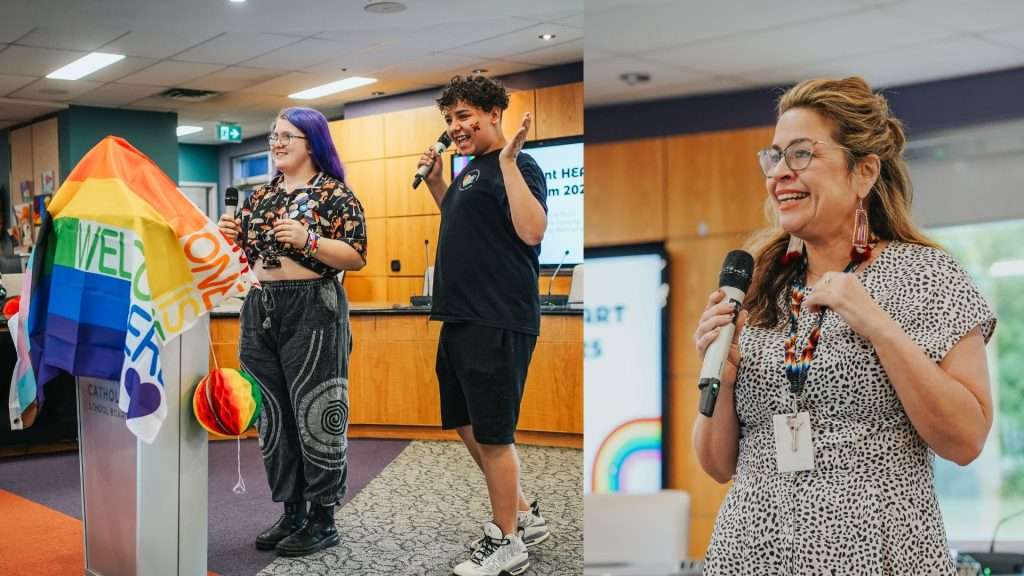 The day began with a student-led prayer followed by a land acknowledgement, setting a tone of mindfulness and unity. Heather Godin from the OCSB Indigenous Education Team led a smudging ceremony alongside a student and shared powerful reflections on the longstanding presence and honour of Two-Spirit people in Indigenous communities. Heather also spoke about the meaningful connections between Indigenous and Catholic practices—both grounded in reflection, respect, and spiritual intention. The smudging and prayer reminded everyone that while traditions may differ in form, they often guide us toward the same purpose: to listen, reflect, and care deeply for one another. Their shared drumming song echoed that message beautifully: you are seen, and you belong.