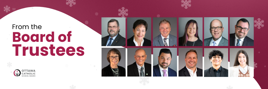 On behalf of the Board of Trustees and our Student Trustees, thank you for the trust you place in the Ottawa Catholic School Board. Your partnership with our schools plays a crucial role in your child’s learning and overall well-being. When families, schools, and trustees work together, we open doors for students to feel supported, valued, and encouraged to grow in both learning and faith.